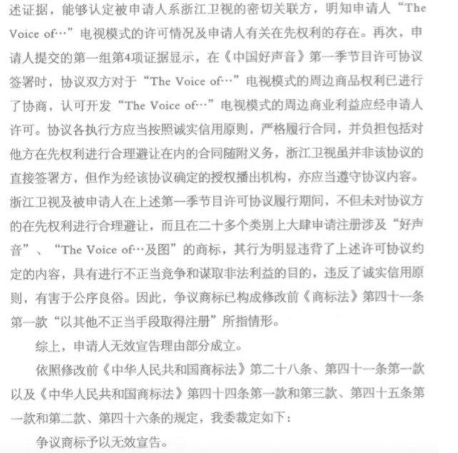 据记者从有关方面了解到,在包括“蓝巨星好声音”等在内的26个商标被宣告无效的这一批裁决书中,作为前四季《中国好声音》播出平台的浙江卫视一并被指违约,商标评审委员会认定:蓝巨星国际传媒的行为明显违背了《中国好声音》授权许可协议约定的内容,“具有进行不正当竞争和牟取非法利益的目的,违反了诚实信用原则,有害于公序良俗”。