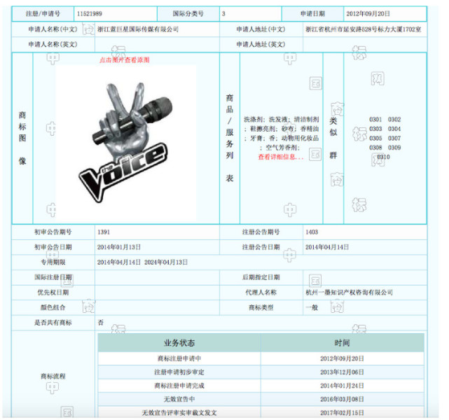 值得留意的是,宣告“蓝巨星好声音”等商标无效的裁定书显示的裁定时间分别是2016年11月和12月,这个时间早于香港国际仲裁中心作出有关《中国好声音》的最终仲裁之前,2017年2月27日香港国际仲裁中心仲裁庭已经将《中国好声音》节目中文名称正式判归荷兰Talpa公司。